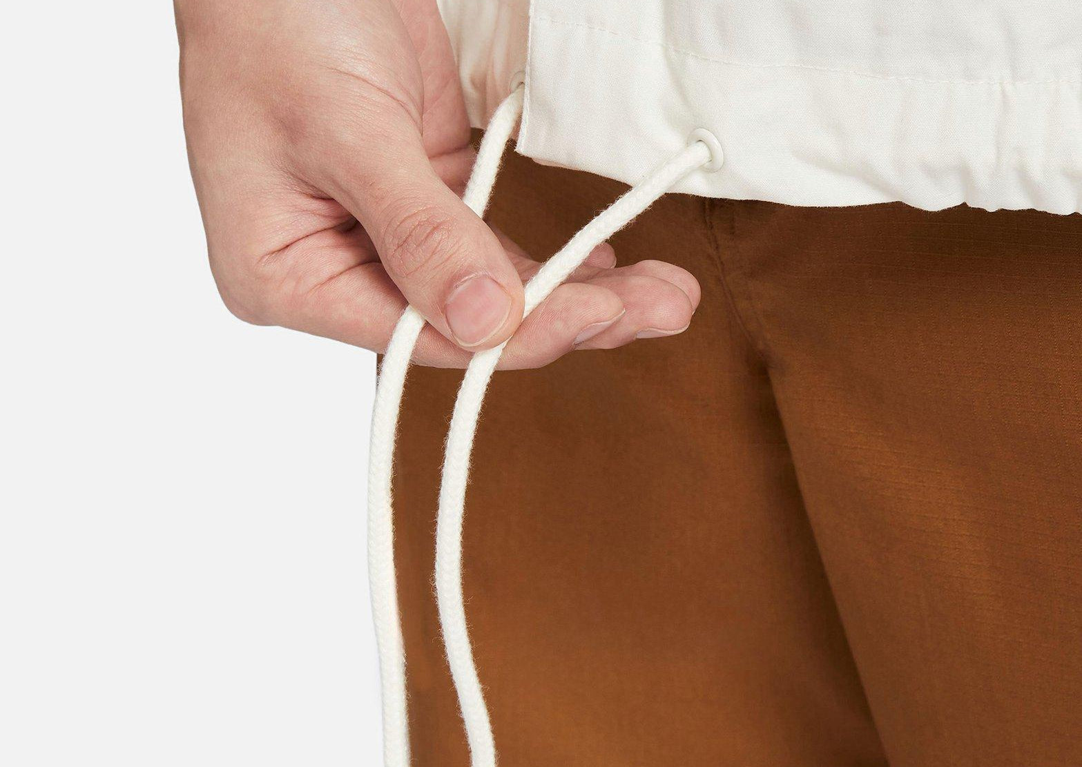 - ด้านหน้าติดกระดุม คอปกแบบพับได้ และชายแบบมีเชือกรูดช่วยให้ปรับเปลี่ยนการปกปิดและสไตล์ได้